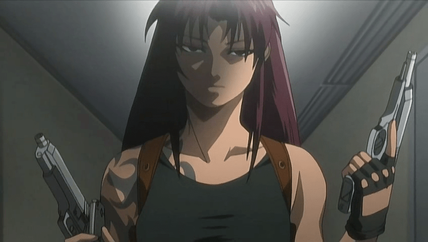 Several things I really like about Revy. She’s gorgeous. Okay I already said that. Her dead eyes, her handful of perfect outfits, her listless attitude, her reddish-brown hair color, and those amazing silver pistols. Okay I mentioned she’s gorgeous. I kind of mentioned this above, but primarily, this is a one of the kind character. Yeah she’s essentially the stereotypical sadistic badass, but of those I’ve seen across many animes, it can be argued that she defines this type of character now. General Esdeath (Akame ga Kill) comes close, but she’s on the fantasy side, so it’s less believable. And that’s one of the biggest reason I claim Revy defines this type of character, her realness. The interaction between reality and anime is a fantastic duality that ebbs and flows between different shows, and helps make anime the great art it is. In Revy’s case, while surely “anime” and beyond doubt a fantastical character (how many cute badass pirate girls do you know?), she is very real in a sense. Her weapons are a good example of this. In one of the last episodes of the series, it is revealed that Revy’s twin pistols are a Beretta 92 model. She has them custom-made (named “Cutlass,” fun for a modern-day pirate), but that is a very real model that’s widely popular around the world. Guns are not a big thing in Japan obviously, so you usually don’t see anything written around the firearms that characters use, so this is pretty unusual, and adds to her “realness.”