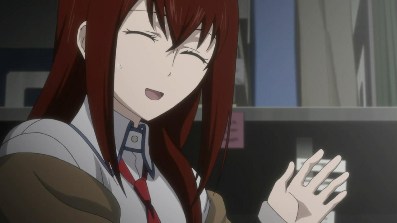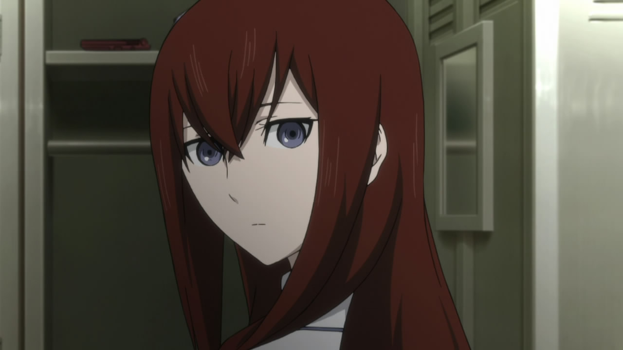 Kurisu, “Christina” as Kyouma puts it, playing on how the Japanese pronunciation of that name sounds similar to how “Kurisu” is pronounced, is an instant favorite. Harsh and cold on the outside, wildly tsundere, but kind and very human in reality. I love how she is the smartest person in the room among their lab members. Daru’s right up there, but in a different way. It’s funny, he’s not “book smart” like she is, but is undoubtedly what we would term intelligent. They kind of personify these two kinds of intelligence. But anyway, back to Kurisu. Red hair, astounding purple eyes, and lab coat make her instantly recognizable. Or, she would be much more so, if Kagari wasn’t introduced later, but that aside. Without Kurisu, Rintaro never would create the time machine and find the Steins Gate world-line. Her centrality to the story cannot be overestimated. Not only is she the brains behind the time machine, but Rintaro wouldn’t have made it his sole focus if it wasn’t for his encounter with her at the conference and the subsequent aftermath there. He puts any number of people through enormous trouble to correct the world-line where Kurisu dies. I mentioned the trouble he causes himself. And I think it’s all for his love for her. Season 2 is so painful for him, and for us, watching Kurisu exist only as the AI Amadeus. We have the luxury of not having to make all those time leaps, but we still realize what he’s ultimately going to do when we see this. We know he’s going to have to go back and find the Steins Gate world-line. Oh, and we’re already aware that he has done that by the end of S1, which helps us make up our minds about him too! But even there, throughout season 2 we get a great deal of context on why he would even consider making all those time leaps. It’s almost entirely about Kurisu, and how important she is to him. I think we would all make the same decision. That’s a great part about this series, and about these two characters.