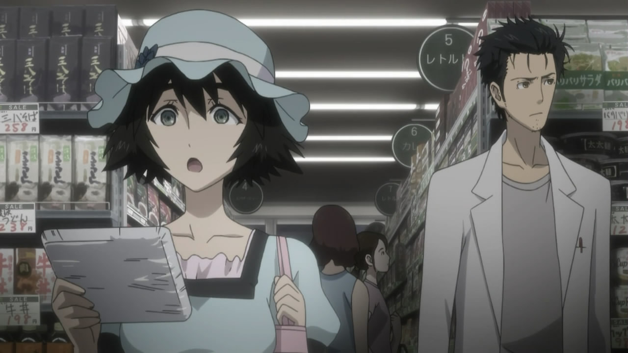 The main set of “lab members” are of course the most memorable. Okabe Rinatro, Shiina Mayuri, Daru Hashida, and of course, Makise Kurisu. Poor Okabe, he definitely bites off more than he’s ready to chew, as they say. The “mad scientist” chuunibyou thing definitely gets him into the weeds, as he sets about having his team build a time machine. But for all that, he goes through more pain and trouble than any human seemingly could endure, and he makes it all work out in the end. I like this character. One of my favorites, Mamoru Miyano (Death Note, Zombie Land Saga), does an epic job with the acting for this character. Season 1 is all the chuunibyou version, Hououin Kyouma, and this guy does a great job with these kinds of situations, where his character himself is putting on an “act.” I love his pretending to talk on his phone about the “Organization,” it’s hilarious once you realize he’s not actually talking to anyone, which you realize pretty quickly. It’s just cringy enough. It definitely sets apart his character. But once season 2 rolls around, Kyouma has abandoned the act and is just Rintaro again, and Miyano puts away the “act” and pulls off a wonderfully troubled and unhappy young man. The contrast is not so great that it’s ridiculous, but instead seems completely believable. I have a good deal of admiration for this performance.