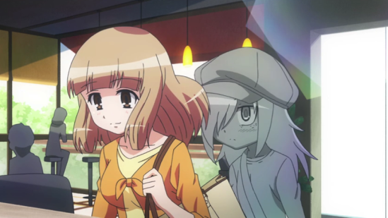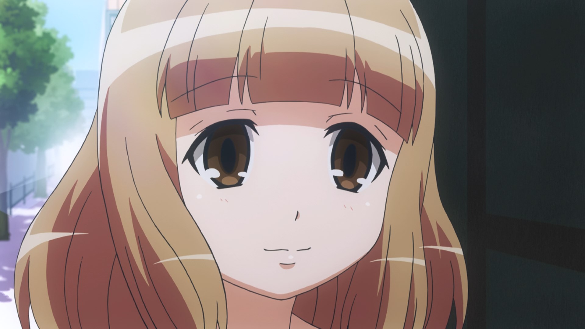 I love it! Every bit of the art in this anime is completely typical. All the characters have traditional eyes, hair, clothing, etc., all very shiny and pretty. Except Tomoko. Nothing is normal about Tomoko’s appearance. She’s really short. Only Kii-chan, her younger cousin, is shorter than her. Her hair is disheveled, long and disorderly and falling over one half of her face most of the time. Her eyes are a different shape than everybody else’s, usually flat along the eyelashes at the top, giving her a tired and disinterested look. The excessive darkness under her eyes adds to this effect. Her jawline and chin is mostly flat too, similar to the characteristics we’re familiar with in child characters. The contrast between her design and all the other characters is remarkable. Take one look at her and Yuu-chan together and you’ll know what I mean. This contrast adds to the discomfort you experience seeing her. Not that seeing her in itself is uncomfortable–by no means, I love seeing her!–but seeing how uncomfortably out-of-place she always seems to appear adds to our uneasiness.