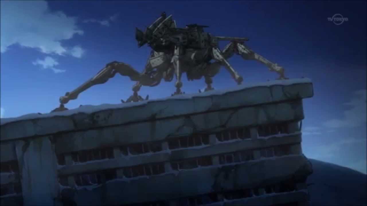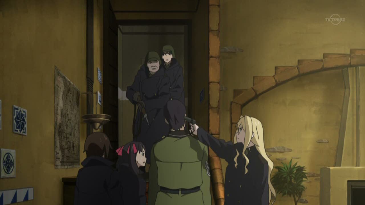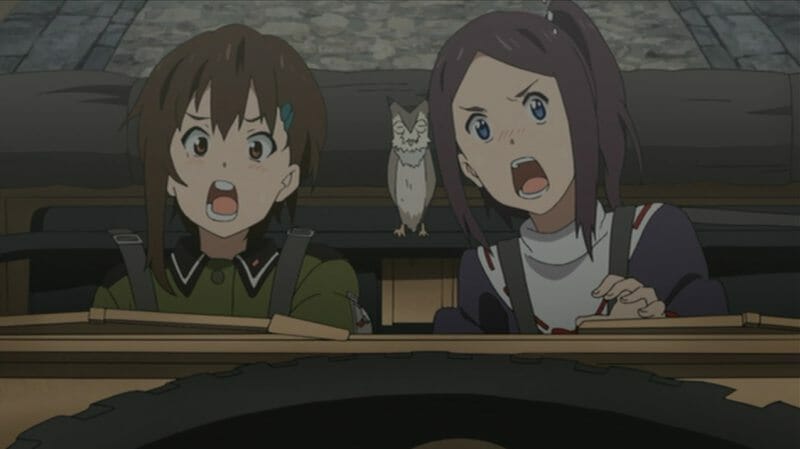 That brings me to the second unusual part of this story: they’re at war. Until the last few episodes, there isn’t any sign of war except the fact that the girls maintain the fortress and run a few ordinary routine checks, maintaining a state of preparedness. While you’re told they’re at war, you get the feeling not much of the action reaches them here. For one thing, five people can’t defend a fort, even if they could manage to keep it in working order. Additionally, their mech/tank is in disrepair, and has been for some time. Noel is constantly working to return it to a functioning state. But more importantly, the girls don’t act like they’ve been in war recently. We later learn that many of them have seen action, mostly very tragically, either in combat or as civilians. But initially the war seems so distant that it almost seems as much a myth as the Fire Maiden stories.