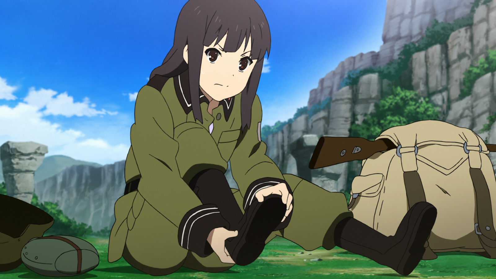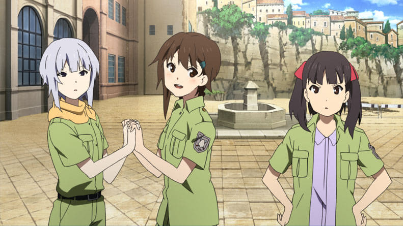 Here’s the most interesting part about this set of characters to me. I’m glad this anime only lasted 13 episodes, because I don’t think I could have taken much more. The happy sadness these girls place on your heart is astounding. I don’t know how many more times I could have looked at Rio without my heart eventually stopping from love. Or even listened to her. Such a beautiful voice! Perhaps this was more heightened by the loss of Sasha in AoT and her connection to her through their mutual VA. But nonetheless, from voice to appearance to behavior to character development, Rio Kazumiya is one of those hidden and priceless gems that we happily find from time to time in our adventures in animedom. As great as all the characters are together in this show, she stands head and shoulders above the others to me. And to the others, who she is in fact head and shoulders taller than! Only Lt. Heideman is similar height among the girls at the fortress.