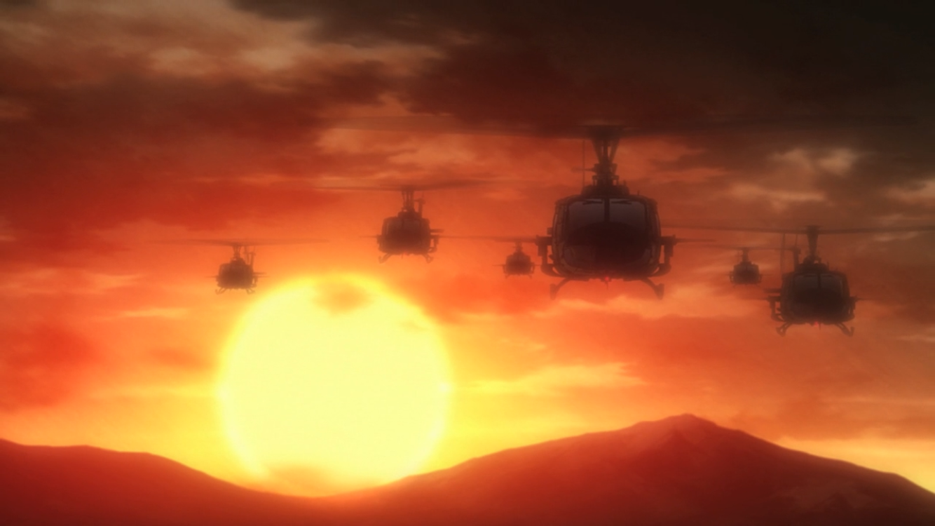 The JSDF slaughters their enemies in the field. You’re recovering from your astonishment at the scenes of the battles themselves, and then you’ll hear the Imperial reports. The entire expeditionary force is wiped out or captured. Thousands of soldiers killed at the first several encounters at Arnus Hill. The army-turned-brigands at Italica overwhelmed in a single night at the hands of gunships and a handful of infantry. It’s astounding, and oddly satisfying. I’m not sure why I describe it as “satisfying.” Obviously there’s a lot of dying. But somehow, you feel something like that when you watch the JSDF completely overwhelm this opponent. I think that contributes a lot to the success of this show. It’s a strange sensation, but I think most people feel it watching this.