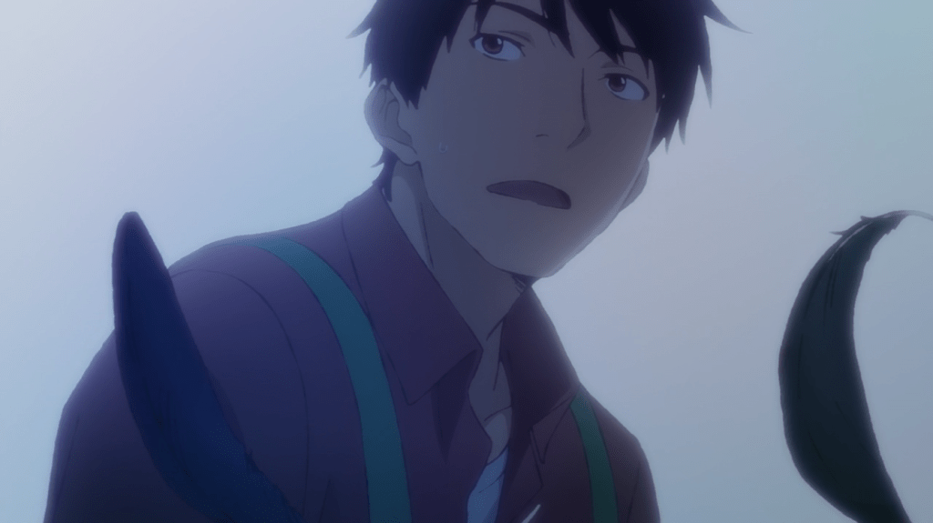 Rikuo is a young man recently graduated from university. But he cannot find his direction in life. He’s not overly dramatic about it, and it doesn’t overly effect his plotlines in this anime, but it defines his life at this point, much to his disappointment. This is the first very human situation we’re presented with in this show. I always promise I won’t let the real world’s issues bleed over into the content on this site, so I won’t say anything further than this is a situation a lot of young people find themselves in these day coming out of college. So it’s easily relatable, and makes Rikuo and his situation relatable to many people. He works ordinary jobs wherever he can just to make enough money to pay his bills. When we first see him, this is at a droll convenience store. At least, it’s droll until he decides to feed some crows one day.