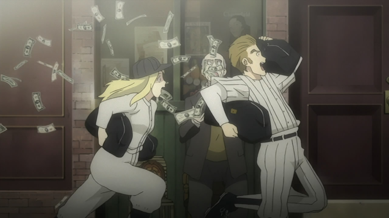 Apparently when people say “the music is great!” in an anime, they mean it’s Western elevator music. I don’t mean it quite so harshly. But it’s that American Tin Pan Alley style of parlor music that we associate with underground nightclubs filled with dim ambience and cigarette smoke and the ominous click of billiard balls. People say the music in Cowboy Bebop is great too, and it sounds the same. Far be it from me to argue with the quality of this music–I like it, it works for these shows–but it doesn’t strike me as “great.” Maybe that’s just American audiences recognizing something familiar in a show, and therefore it ends up discussed more than perhaps it deserves. I have no problem with the music, but it’s just kind of there to me. It doesn’t add much more than its contribution to the time period feel.