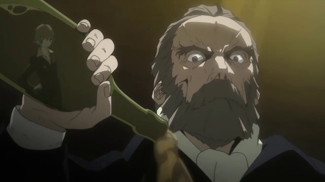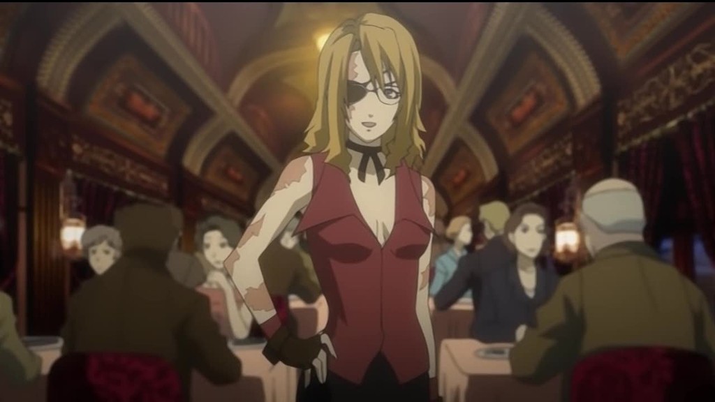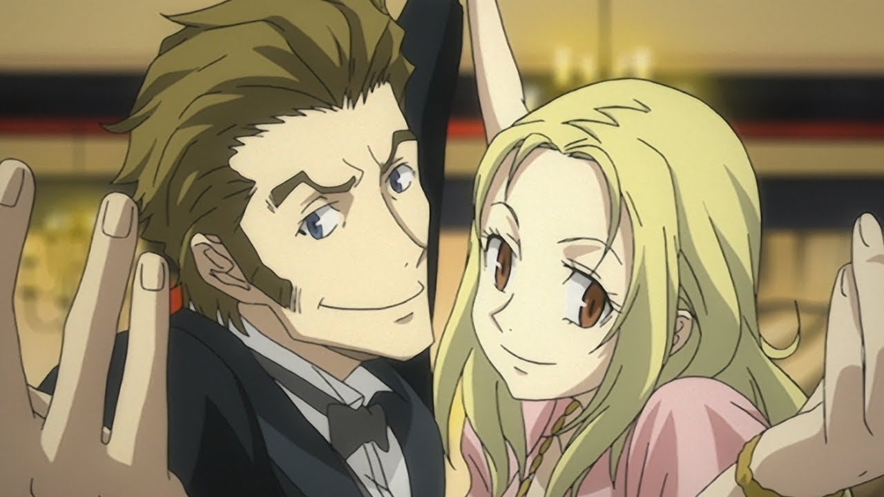 The most obvious oddity is the Immortal elixir. This story is all ordinary mafia crime mystery except for this crazy supernatural aspect. These guys can’t die. They drink the goo and even mortal wounds—like having your head blown off by a shotgun slug, or no less than twenty Thompson .45 blasts through the torso—heal away within seconds. The modern proliferator of this substance, Szilard Quates, is trying to recreate the original formula, which allows you to not only be immortal, but also prevents aging. His current attempts created an elixir that doesn’t prevent aging, but does keep you alive, much to the frustration of his decrepit clients. A handful of people get this elixir (Dallas Genoard, Isaac and Miria, and probably Ennis and the other homunculi who we don’t see in the anime), but a lot of the Immortals we see got the original elixir. Szilard Quates looks old, but doesn’t age any further than his current state. Czeslaw is the best example of course, stuck forever at ten years old or thereabouts. Maiza, a side character among the side characters, is an original, at one point the leader of the alchemist group. We see a couple more of the originals in the last special episode, Elmer Albatross and Slyvie Lumiere. We don’t learn much about them except that this all started with them, Maiza, Quates, and a group of other alchemists from the early 1700s.