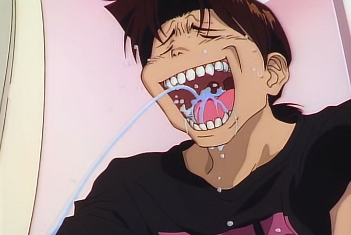 Do I adore it because it’s extraordinarily beautiful? No. In fact, there’s times when it’ll have you scratching your head at how grotesque it becomes. Perspective usually plays a big role here. By that I mean there are certain angles we view characters faces from that make the faces look really wrong. Usually this happens on the girls, and I think a lot of it stems from their very pointy chins and very small mouths. Small mouths are common to almost all anime drawing (One Piece excepted), but the very pointed chins are a big ’90s feature. You see this in GTO, Neon Genesis Evangelion, Monster, Cowboy Bebop, almost any ‘90s-style anime you can name. And while I love this version of anime artwork, making the human appear non-human and the non-human nonetheless appear human, occasionally a female character’s face will turn in such a way that the spacing of the eyes and nose and mouth appear very off. This is particularly pronounced if the chin starts to recede towards the neckline and almost disappear. I don’t think this is always intentional by the artists, but is simply a consequence of this facial style. It’s not a terrible thing—you only notice it occasionally—but it appears often enough to warrant observation.