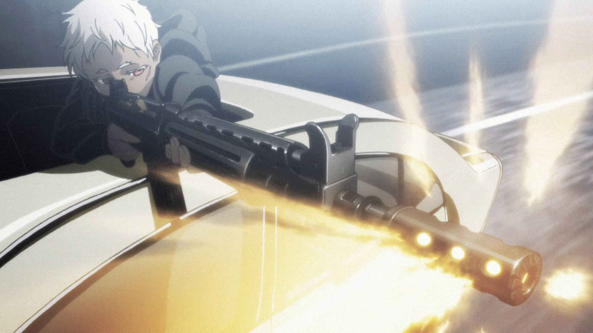 That aside, Koko is a strange character. While a teenage girl is never out of place in any role in anime it seems, arms dealer was a new one to me. She doesn’t overdo it either. Her subtle emotions and eccentric outbursts are thrilling, inspiring, and chilling all at once, evoking a sense of power and exciting the senses. But it’s never in your face. While I like when powerful female characters show forth their power (and we see a bit of that in this series, and it’s amazing!), Koko’s obvious reticence is mysterious and highly intriguing, almost adding another layer to the sense of power we perceive from her. Her entirely white appearance is intriguing as well. She’s very much in contrast with everyone and everything around her. Her cohorts are sunburned and muscular hard-asses, every last one of them (Jonah’s muscles excepted), and they’re clad in black or various military colored outfits. Koko wears white, has deathly white skin, and white hair. The name “Hekmatyar” is likely truly “Caucasian” in origin, a term which geographically refers to a region from East Europe to North Africa and the northern parts of the Middle East, despite most people’s common understanding of that word. So her family is perhaps Persian in origin, or thereabouts, and it’s conceivable that she could have this combination of hair color and skin tone. But it adds a ton to her mystery, even if we realize it doesn’t have any bearing on the story overall.