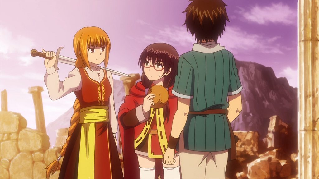 The Kahabell-Yuusuke scene was very pretty, emotionally and visually. There’s that “game” quality to the artwork, particularly in the characters, almost like a Persona series or Danganronpa, but the rest of the art is fairly normal. That scene was nicely sunlit and very pretty. Then there’s the monsters–nothing exceptional there. In fact, the orc or goblin queen thingy was kind of dumb actually. But there is also a dragon, and it seems decent for the little we’ve seen of it in the volcano and the premonition Yuusuke keeps seeing.