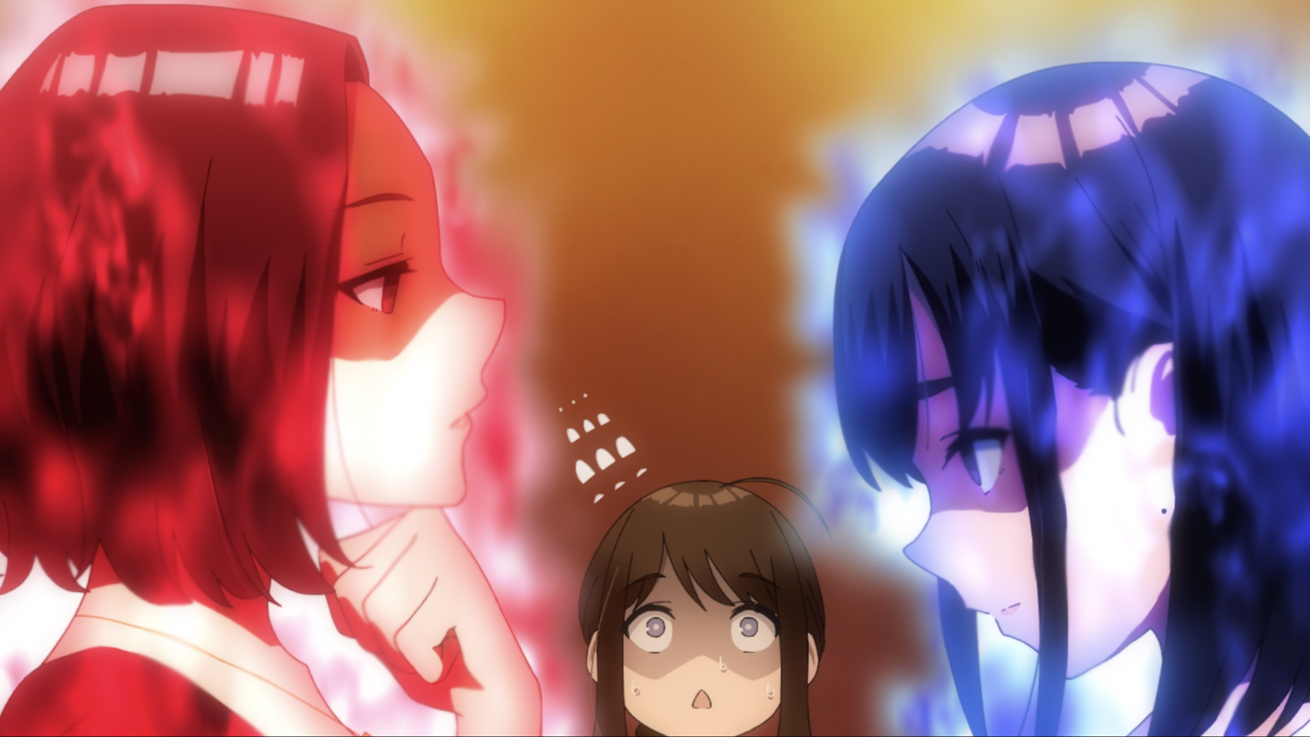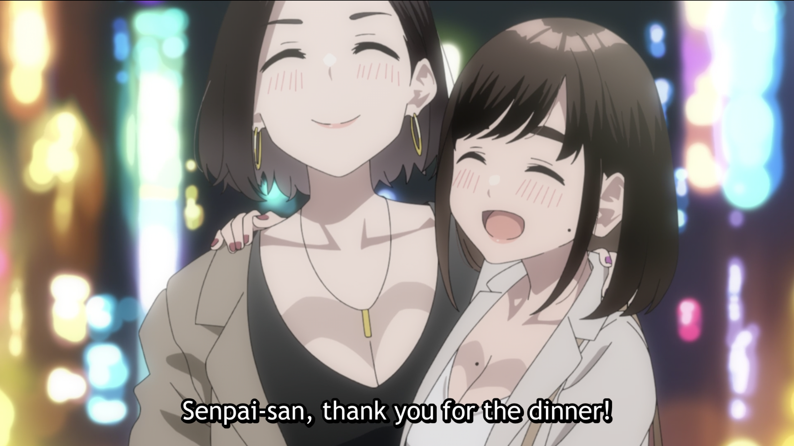 Speaking of great voice acting: Sumire Uesaka, as in Nagatoro (Don’t Toy With Me, Miss Nagatoro), Shalltear Bloodfallen (Overlord), and Sanae (Love, Chuunibyou, & Other Delusions), plays Kouhai-chan. Kouhai-chan is her rival for apparently the only man in this office setting any of the ladies care for. Lucky him. Anyway, she Uesaka definitely makes this character. Her purring voice is out to seduce Douki-kun from the moment we meet her, if her physical attributes failed to do so. I always knew she was the rival and didn’t want her to succeed, but between her voice and mannerisms and knowing this was the same voice as Nagatoro (which had just finished when this show began airing), I couldn’t help but smile when she was around for any length of time.