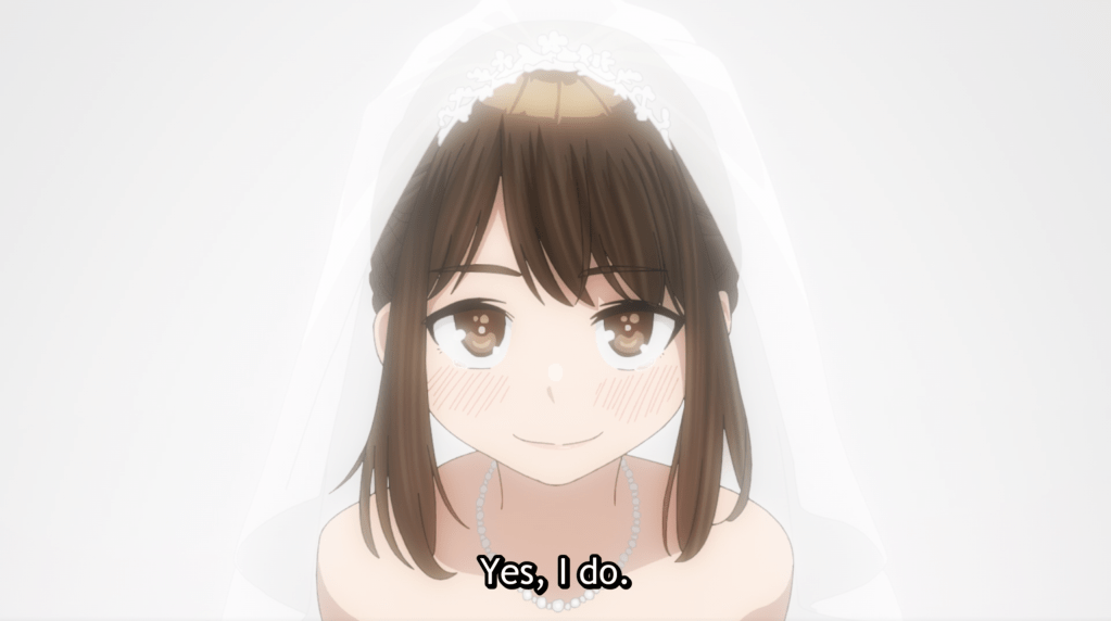 But what I really like is when you put all that aside, you still have an astounding visual display. The artwork isn’t intricate or astounding by any stretch, but it has a simple beauty that I adore. I love the styling on these characters! Big soft eyes that are mostly real-world colors, light hair that falls in all the right places, round cheeks that glow and invite gentle pokes, amazing skin tone, and adorable expressions that would melt the hardest heart. The episode where we saw Douki-chan imagining her wedding was enough to make a grown man cry. I wanted to say “Yes” right there!