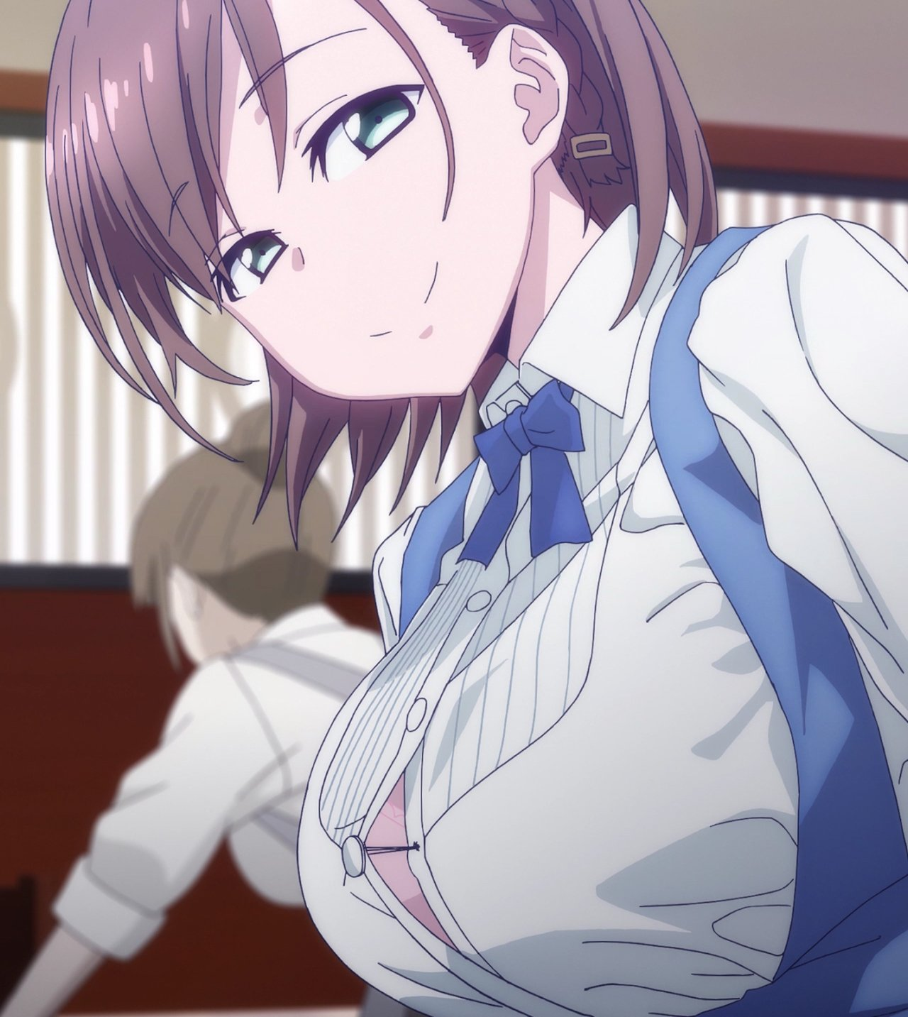Other than these two, some of the characters are difficult to tell apart. One of the reasons is their physical features. They all have brown hair and big boobs. But another reason is simply that each episode flashes quickly between sets of characters, and sometimes it’s not clear which set we’re watching. And the characters are usually related to each other somehow. Not by family—hell no—but by position usually. Like, Ai-chan’s volleyball friend is Salaryman’s niece—we all know that’s not family—and Kouhai-chan and Senpai work at Salaryman’s office. Maegami-chan and Sensei end up renting the apartment next to Ai-chan’s apartment, after previously living next to Salaryman’s apartment (stop me if I’m wrong—I might be misremembering that). So it gets a little confusing.