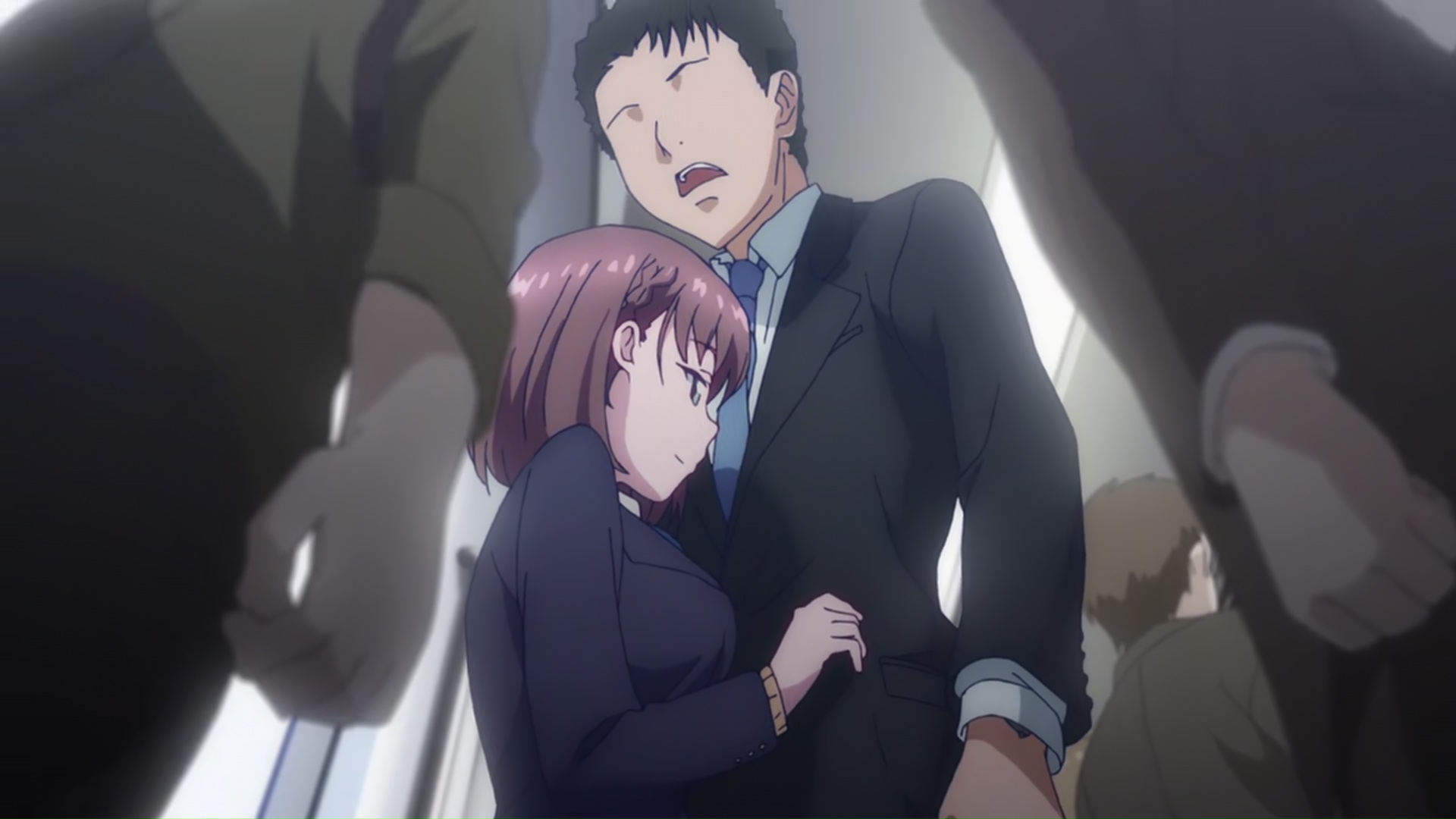 Ai-chan is the primary female character. I don’t say “main” character because that’s not how this show really works. But she’s certainly the first girl we encounter, and probably the first character the Tawawa illustrator created, or at least the first girl featured in the Tawawa illustrations. She’s a sweetie. Her deal is that she has to travel to school by train. Let’s say that her heightened sex appeal would probably make her a target of lechers on the crowded train. She meets a male character who the series simply calls “Salaryman,” an office worker who also rides the train on her route, and this nice man stands near her and passively protects Ai-chan from perverse assaults. Nevertheless, his male instincts are no less subject to Ai-chan’s charms, and he regularly sweats heavily as Ai-chan presses him, literally and otherwise. For her part, she seems grateful, and this translates to affection more than a little.
