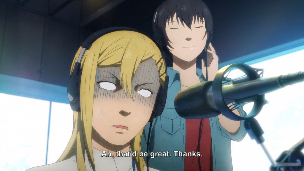Speaking of legendary voice actors: Sayaka Ohara plays Madoka Chishiro, the top radio personality at Minare’s radio station. Sayaka Ohara, as in Erza Scarlett (Fairy Tail; and subsequently as Elsie Crimson in Fairy Tail’s child, Edens Zero), Ouzen the Immovable (Made in Abyss), Irisviel (Fate/Zero), Sofia Valmer (Jormungand), etc. So many powerful, amazing characters! My heart skipped a beat when I learned she was in this show. It’s perfect for her. Chishiro-san doesn’t have a lot of lines in this show, but that imperious voice is not to be mistaken when she does speak! It leaks through every fiber of your being.