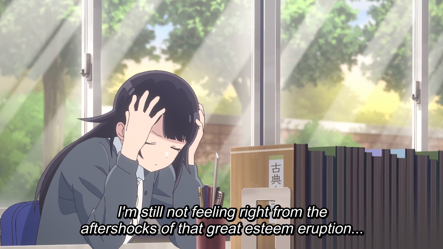 I loved this. I’d start to get worked up the moment I saw Toubaru-sensei. “Here we go!” I’d think. She’d get all worked up about “esteem” and the blood would launch from her nose. I laughed more each time this happened, and I’m at the point where I’m looking forward to seeing more of this same routine in a new season of this show. All the individual character gags are like that: you pretty much know it’s coming and yet it’s still funny, almost funnier, every time, and you find yourself looking forward to more of it.