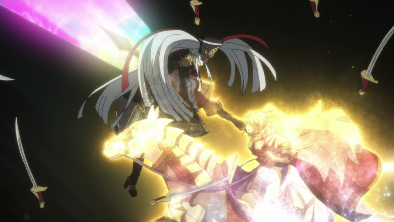 The animation was okay. I thought it could have been better, but I also give it some leeway here. The reason is again because of the genre mixing. You’ve got Alicetaria swinging a knight’s lance at Yuuya with his katana, and Selesia striking with her sword at Mamika, who wields a stereotypical wand-like instrument customary to magical girls. Altair slings swords at people like some wild character from the Fate/ series, and sometimes even a mech has to dodge them. Weapon designs, I’m guessing, are usually meant to fit the action of their particular story, and often are specific to genres because of that. Suddenly here we find ourselves pitting unfamiliar opponents against each other: this is unfamiliar territory for anime artists. So I expect the action sequences to have a lot of that blurry action that I don’t particularly prefer, but which is understandable in this case.