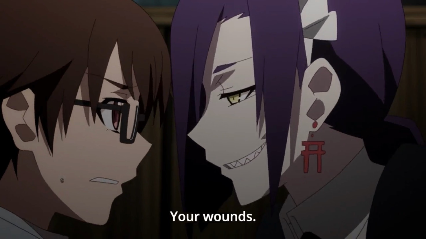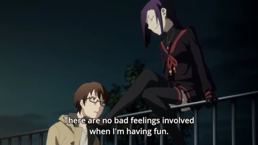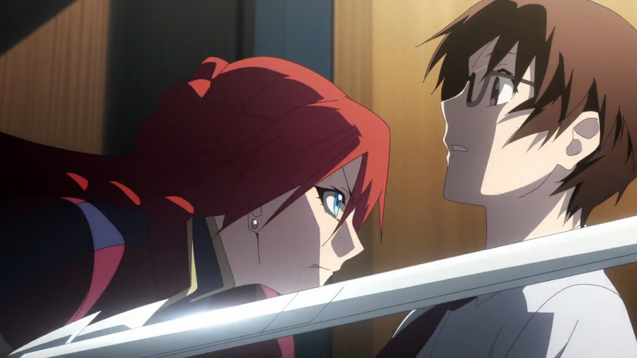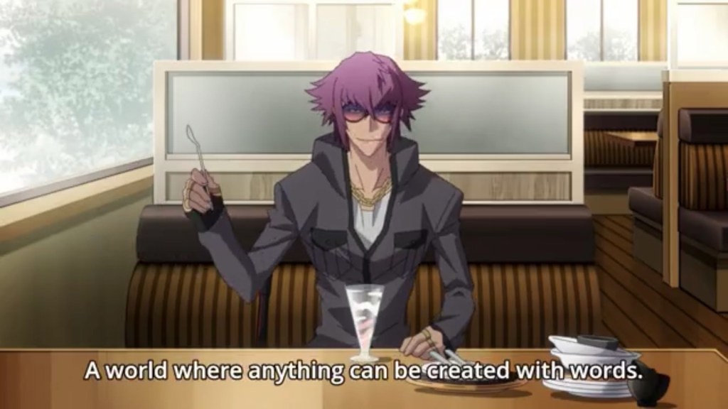 I will honestly admit I had very little idea what Chikujouin was ever saying. Most of the time she was talking I was trying to figure out how her skill worked. And she talked so much! A lot of her dialogue is in one-on-one conversations with Souta, the male protagonist of this series. He mostly just stands and listens to her, and when he does talk back he digs himself deeper into her traps. I usually didn’t know what exactly she was talking about or what she was trying to attain, but I do know it was magnificent to listen to. Whether what she was saying made sense or not, it was complex and confusing, the way a dishonest character trying to entrap people with her words might speak. And it was rattled off without hesitation. Like, you don’t know how someone could speak like that unless they had a script, yet you couldn’t imagine how someone could come up with that kind of a script. It was crazy, amazing.