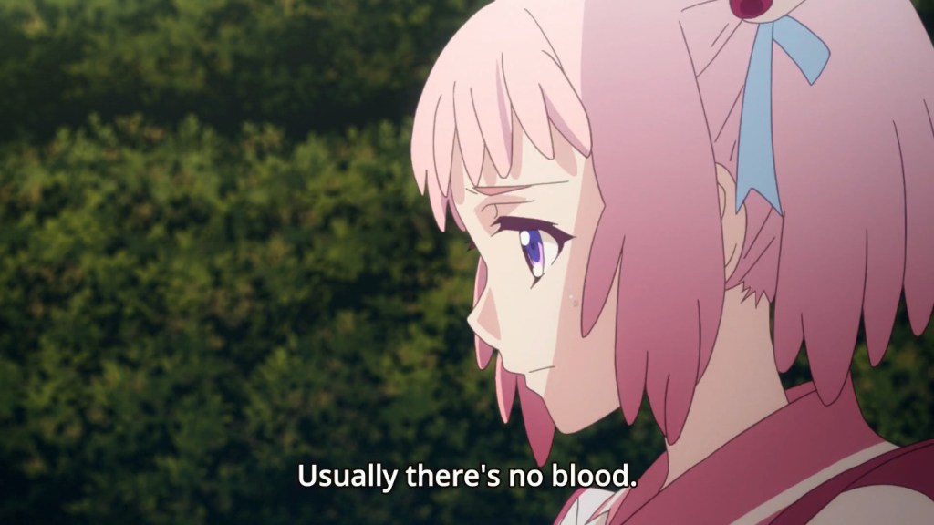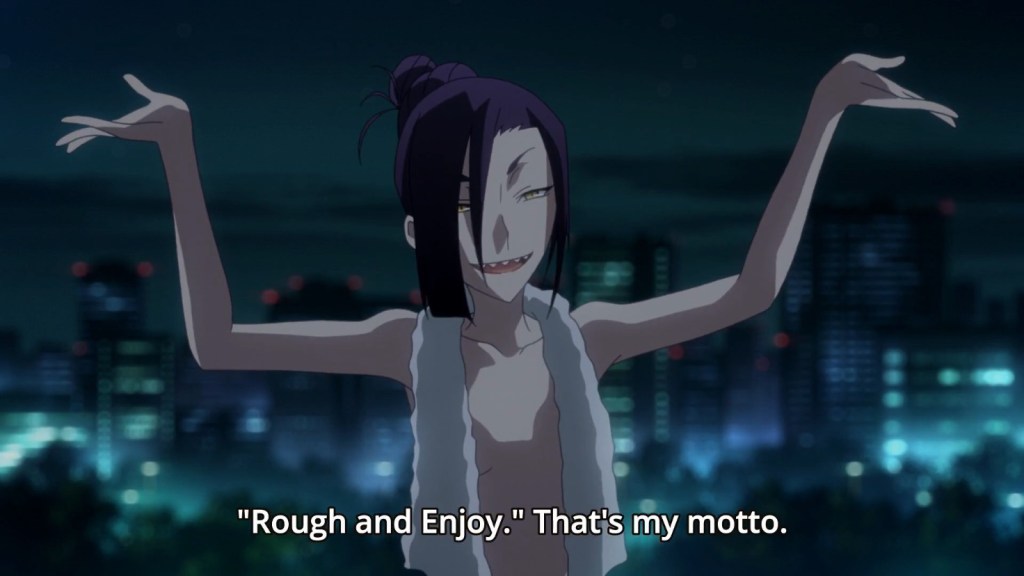 Magane Chikujouin-san is elevated to astronomical heights by Sakamoto’s performance, but I already liked this character when I saw her in the opening sequence before we ever met her. Her serpentine eyes, shark teeth, jeering expression, and narrow form are a magnificent design. Then she arrived and was a total badass. She didn’t give a hoot what anyone else thought or wanted. She knew who she was and was going to plot her own course through this situation. And not through overpowered skills or extreme defensive stats or anything typical like that: through her own words.
