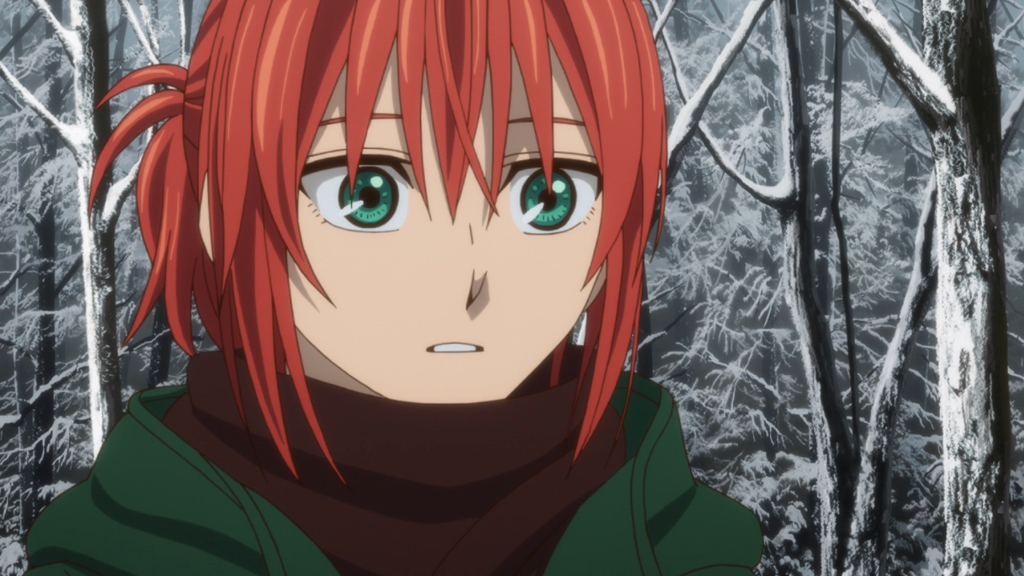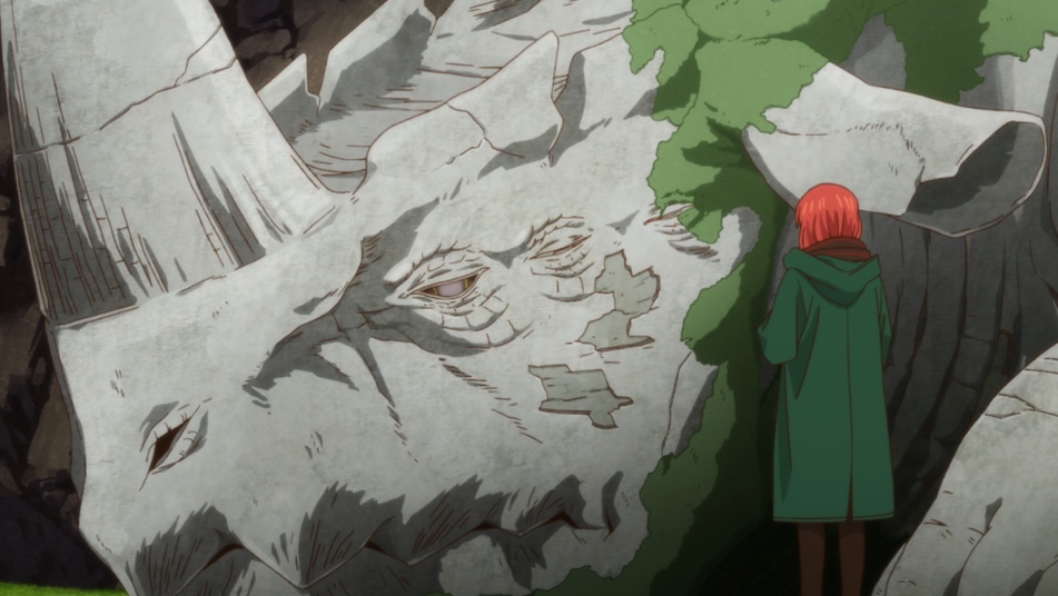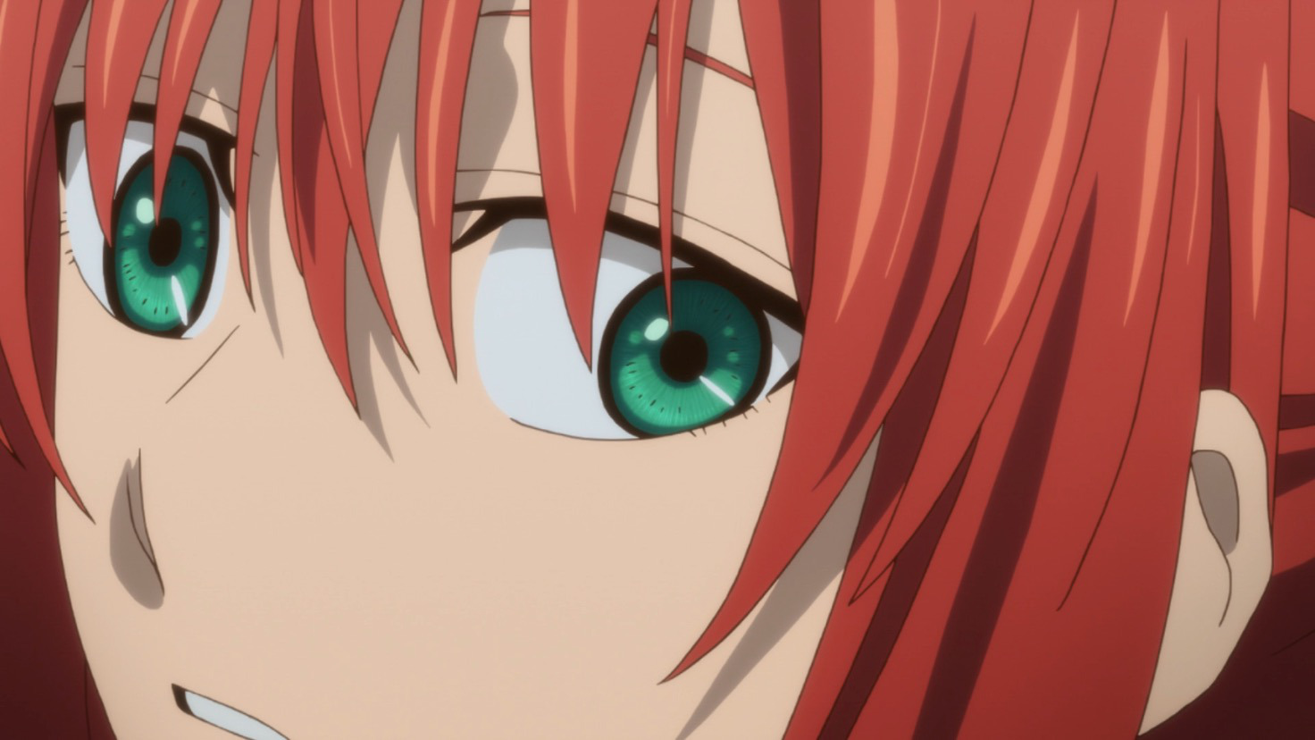 In general the artwork is pretty typical of late 2010s anime. Outside of the spectacular parts I’ve already mentioned, much of it is very ordinary in some senses. The coloring is varied and a little too saturated in some places, like inside Elias’s study where the red is very red, and I’m not sure why. The eye-popping color is important in Chise’s eyes of course, and in places where red accents are important like Elias’s and Ruth’s eyes (and Chise’s magnificent red hair too). And it makes the lighting more interesting in certain scenes as well, notably where magic is being cast.