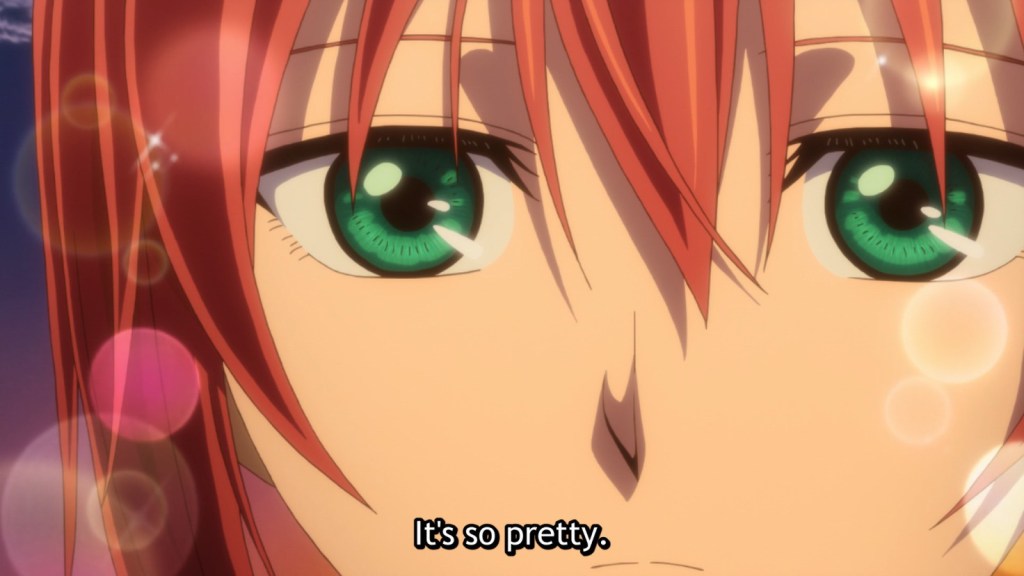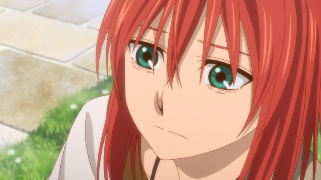 Much of her personal beauty comes from her personality, in my opinion at least. A lot comes from her visuals, which I’ll get into more below. But a lot also comes from her voice. Atsumi Tanezaki voices Chise. Tanezaki hasn’t done many main roles until 2017 or so, also the year this anime aired. But since then she’s done several memorable vocal roles, notably Rio Futaba (Bunny Girl Senpai), Anya Forger (Spy x Family; I know, I could hardly believe this either), and most importantly Vivy from Vivy: Fluorite Eye’s Song. Rio Futaba, if I remember correctly, has a similar tone as Chise here, but Anya of course has a very lively little girl voice, so Tanezaki can do the variety thing well. It’s her role as Vivy that intrigues me the most. That role is all about the voice, if you recall that show, and Tanezaki does a great job with Vivy, including the singing that’s key to that show. As Chise she speaks very softly but very clearly, often without much emotion but also very humanly, if such an adjective can be applied to human speech. It adds to Chise’s character significantly.