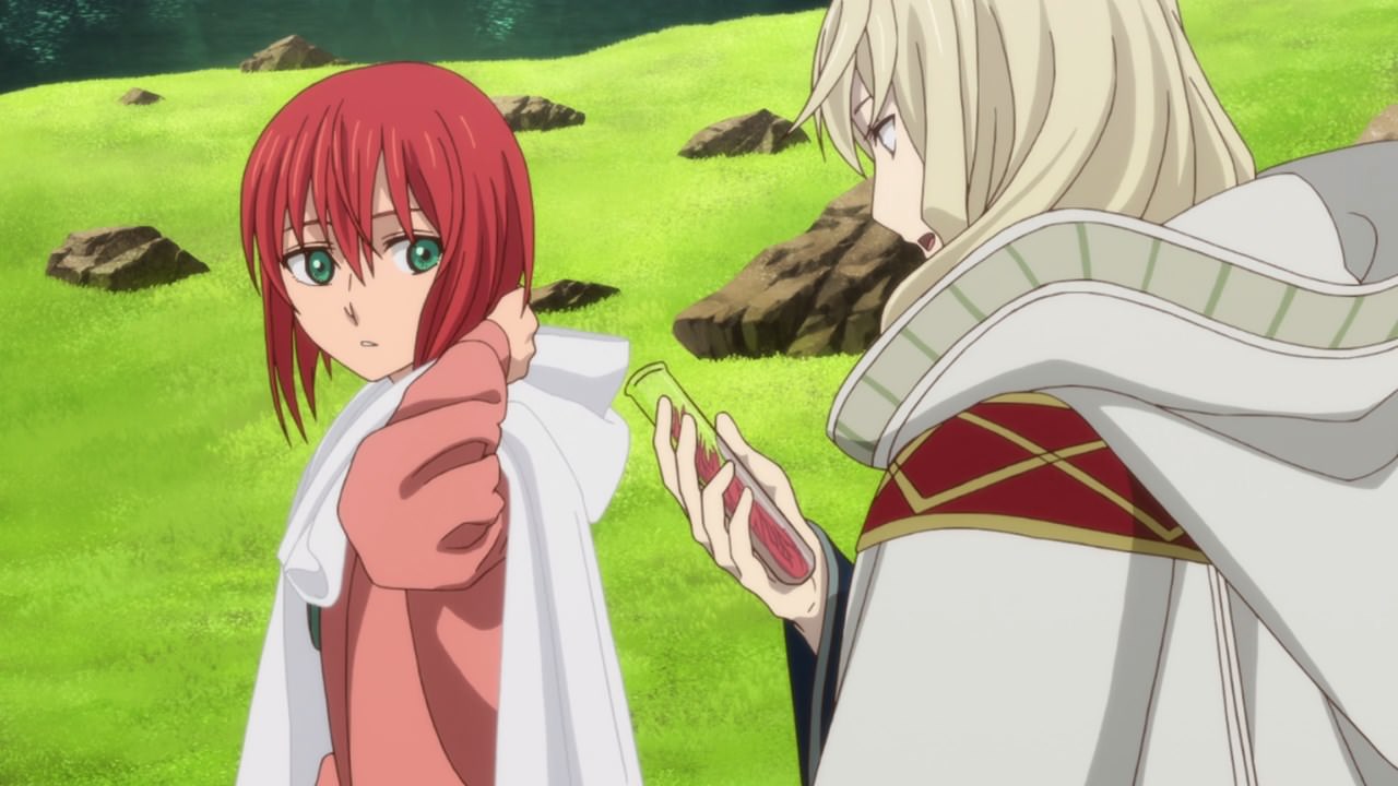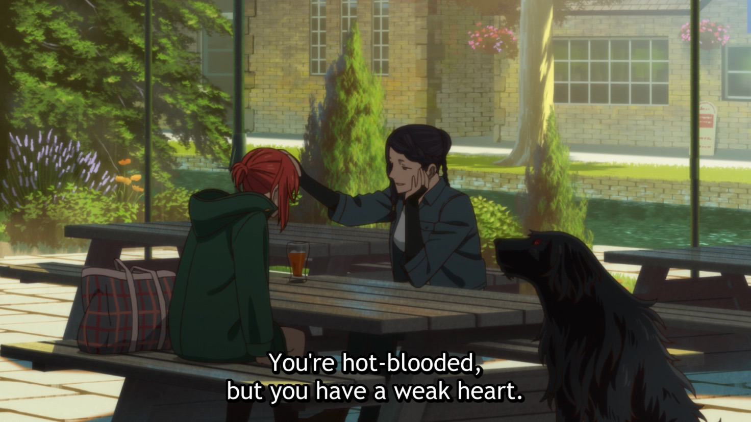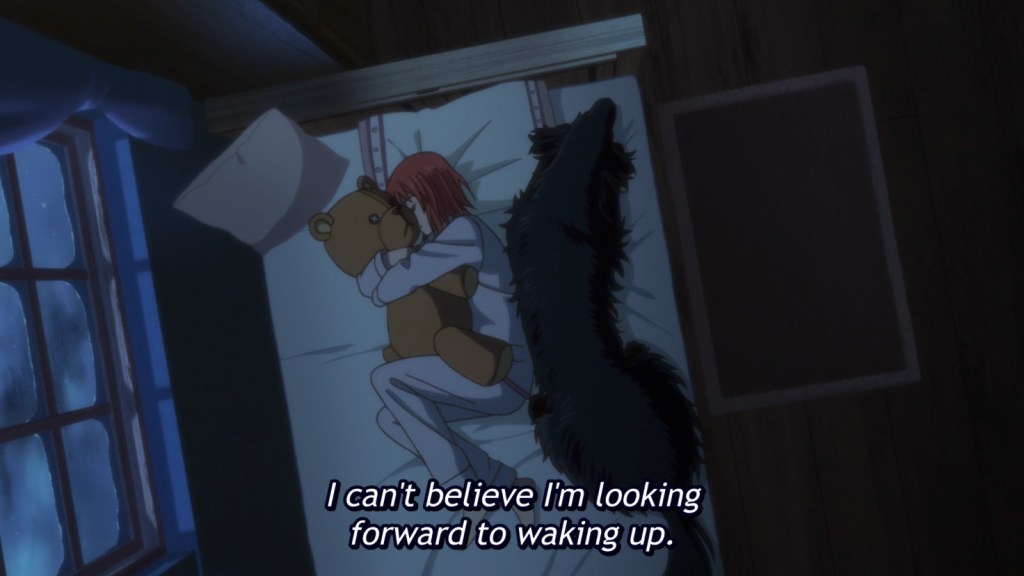 I did not like when the Cartaphilus storyline took over the entire show, therefore. It was inevitable that it would become an overarching storyline, as it reared its head in the Ruth mini-arc, so it had to be resolved at some point. But it ended up feeling like it was a major part of the story instead of just another mini-arc, which it ultimately was. It ended up feeling like a secondary main plot, and I didn’t like that. And I didn’t like him doing the eye swapping thing with Chise—that bothered me on a lot of levels—but I stray. It distracted from Chise and Elias and almost forced Joseph/Cartaphilus into the main character group. This show was best when the focus was entirely on Chise and Elias and whatever they were dealing with at the moment, and this brief storyline with Cartaphilus detracted from that. Chise and Elias’s relationship should have been the only overarching storyline.