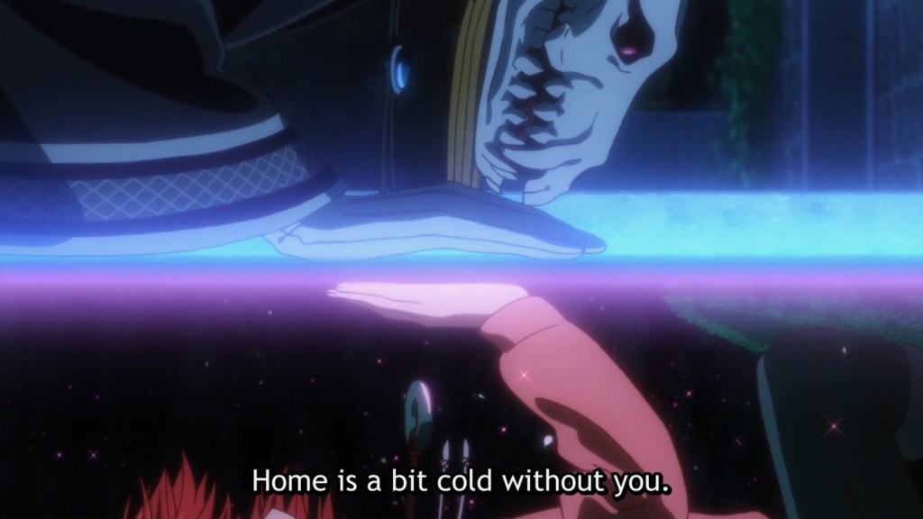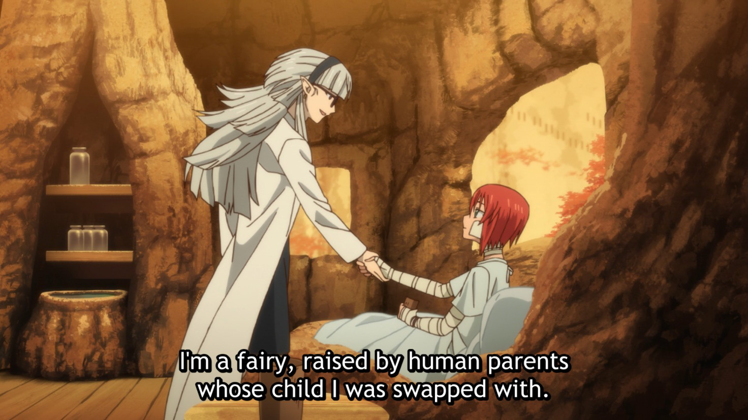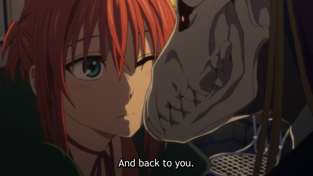 I definitely hypothesized that it was emotion he was missing. But I abandoned that hypothesis by the time I finished the series. But I think Elias thinks he’s missing it, or at least is misunderstanding emotion fundamentally. His relationship with Chise is a good example. He really does think, somewhere inside himself, that he simply obtained Chise for some purpose, as if he were Ainz from Overlord and had some heartless goal in mind, be it good or evil. He regularly asks Chise to explain things about emotions to him, asking her to be his “human teacher” just as he is her “magic teacher” (something I thought was simple but cute). But it’s hard for us the viewers to actually believe he’s not motivated by emotion. His vicious reaction to the threats on Chise’s life are a great example of this. Anger is not a choice. And, perhaps most interestingly, this angry, emotional reaction actually pulls the monster out of him, and he becomes more monster than human. That’s a really nice piece of writing in his character, but is such a potentially extensive topic that I must simply touch on it in passing here and continue on for now.