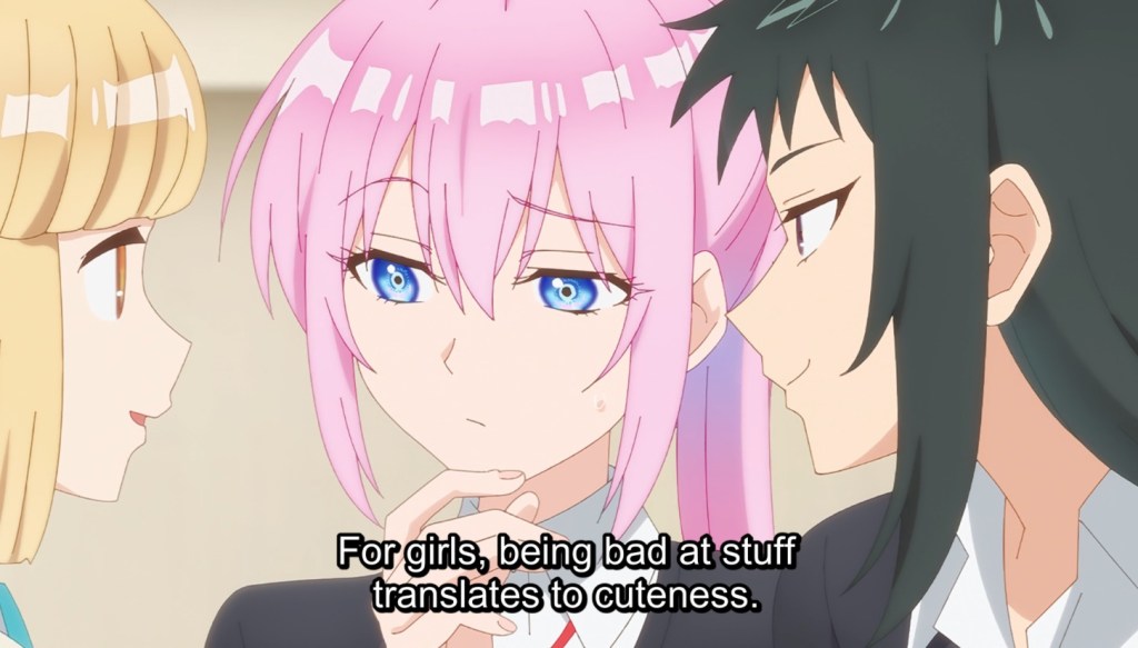 Maybe that’s a little deeper than the author wanted to dig for in a rom-com, but I like all that’s going on there. It’s pretty powerful. It uses themes of coming-of-age, staying true to or discovering your true self, and the power of that true self and its discovery. Most of us have seen these themes before, and usually we see them in really good or really memorable anime. Was this a missed opportunity here?