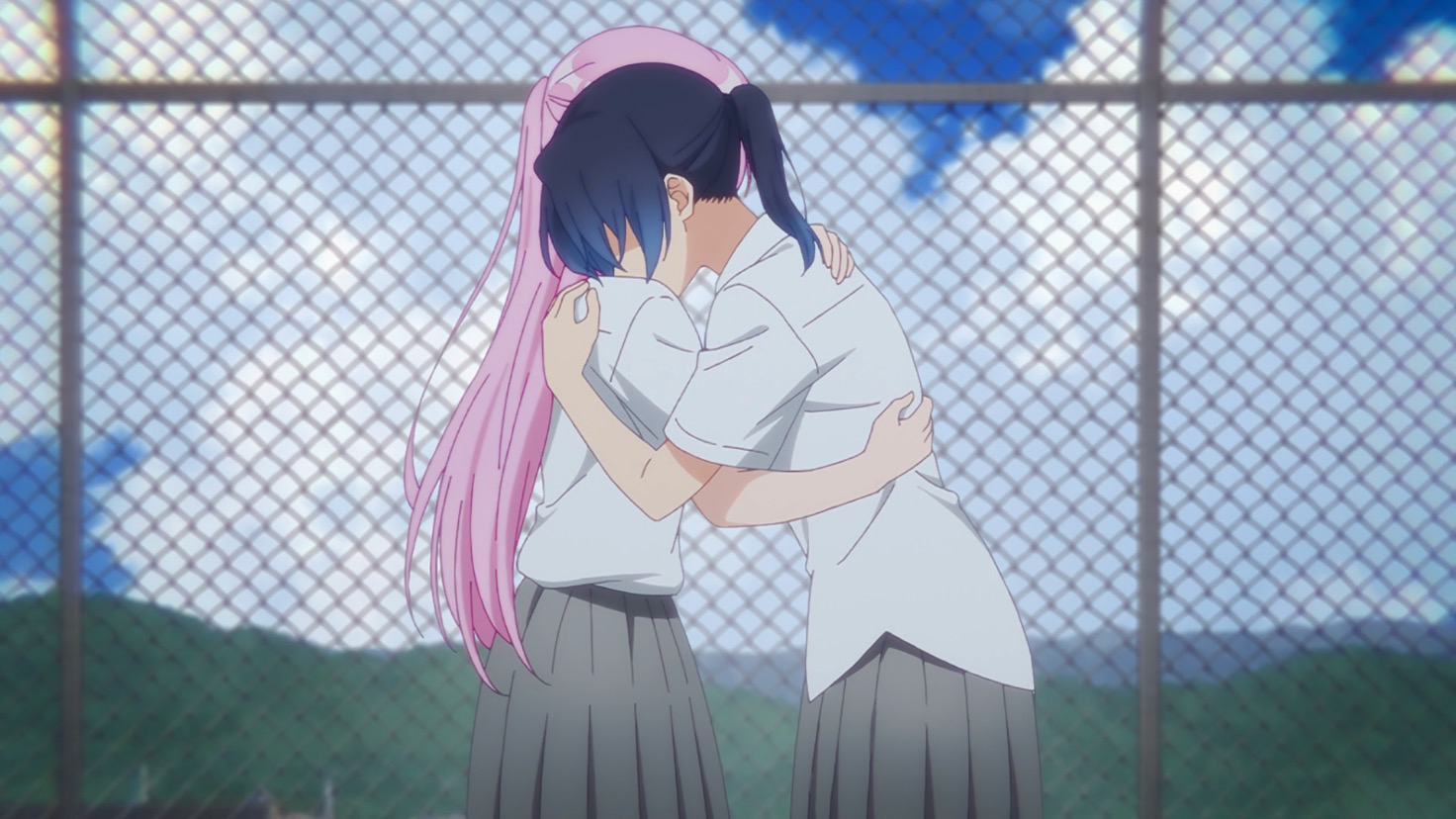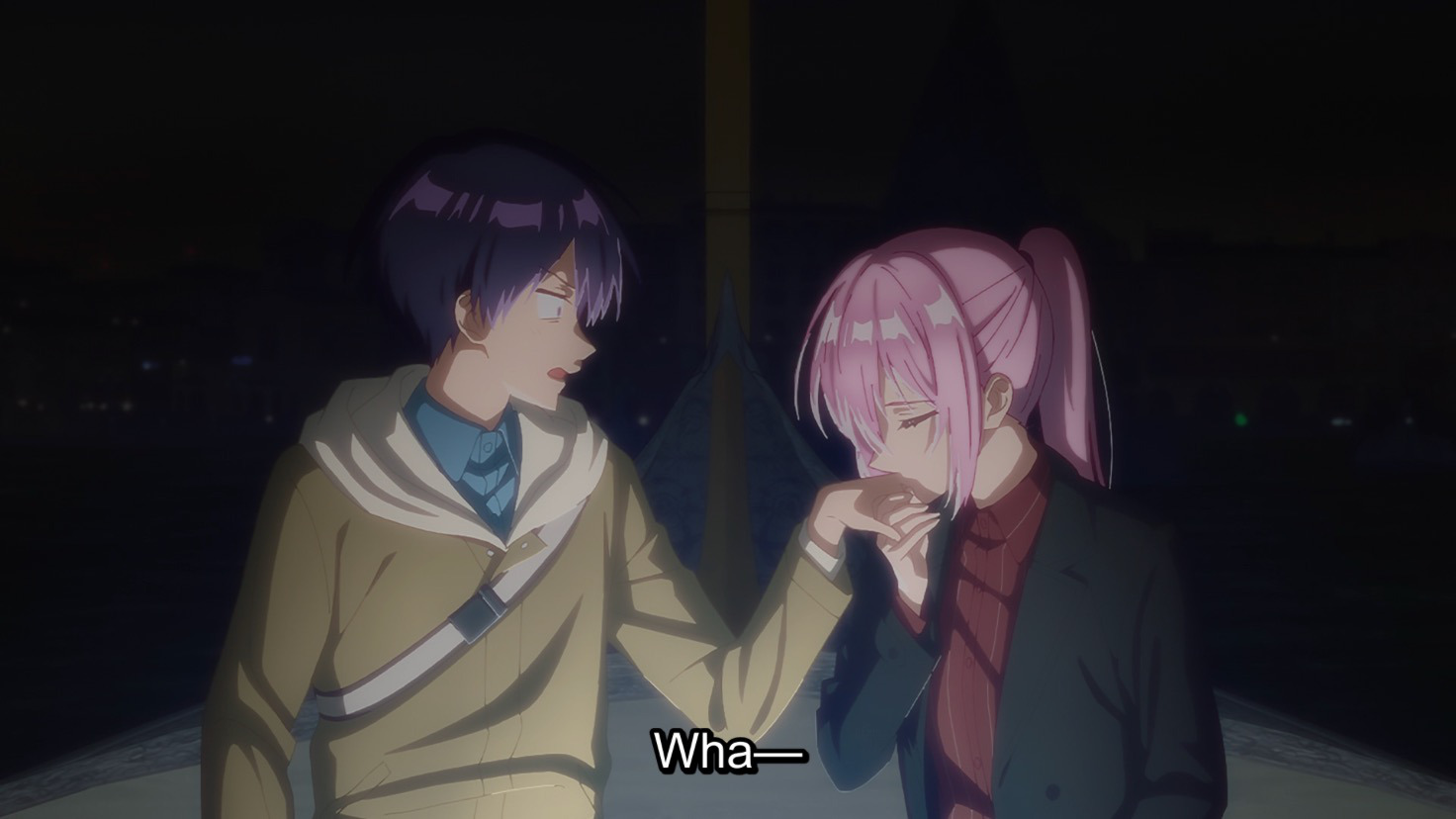 Izumi’s eyes are almost as glassy and pretty as Kamiya’s, but not quite. Or maybe it’s just me seeing through a prejudiced lens, because I really like Kamiya’s look. Her blue hair and bluish-purple eyes are magnificent. When she and Shikimori have their couple of episodes—episodes—together, the contrast between their two styles is very nice. It was a pleasure to watch visually, all other content and context aside.