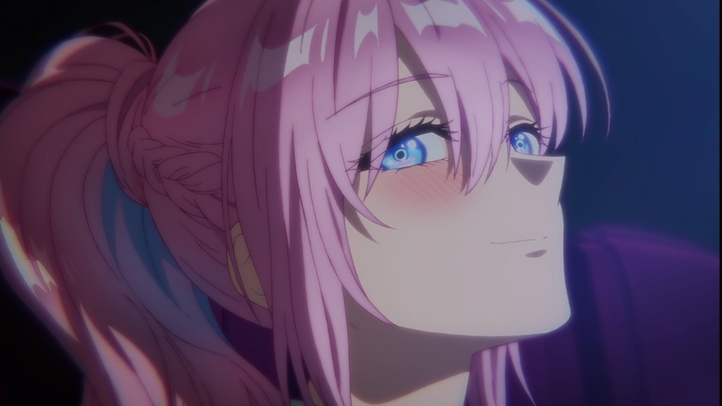 But eyes benefit from the strong lighting even more than hair. Shikimori’s blue eyes are powerful. Scary almost, hearkening again to the horror thing. She really does transform in those frames, even though nothing about her appearance really changes. Her blue eyes are a big part of that. They match that undertone in her hair too, which makes my brain do happy dances.