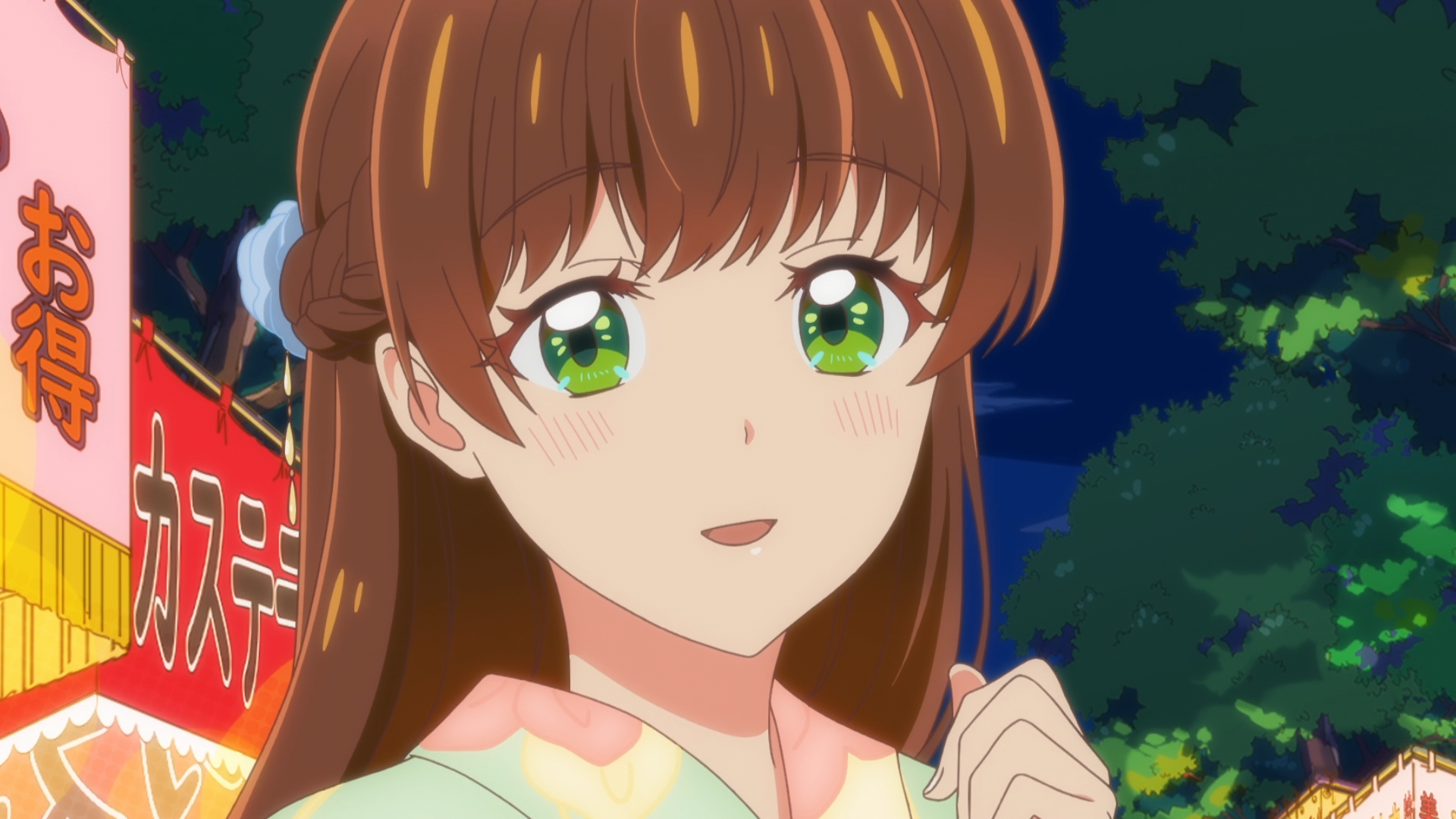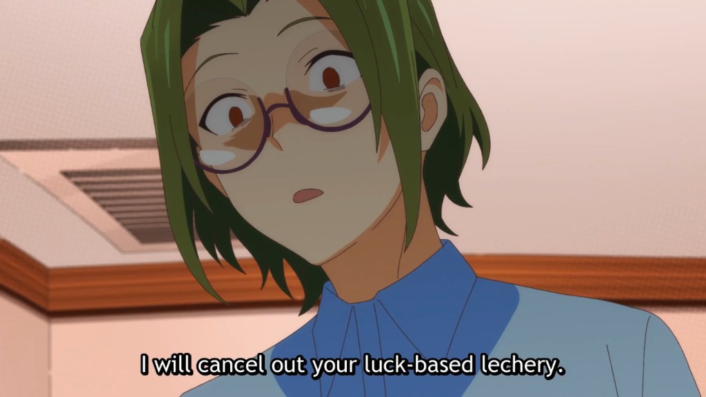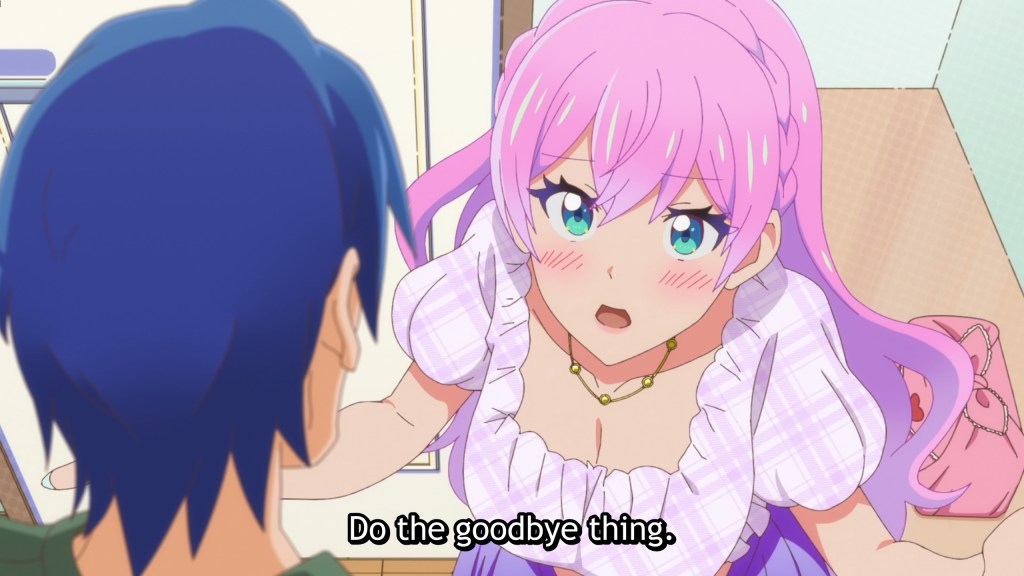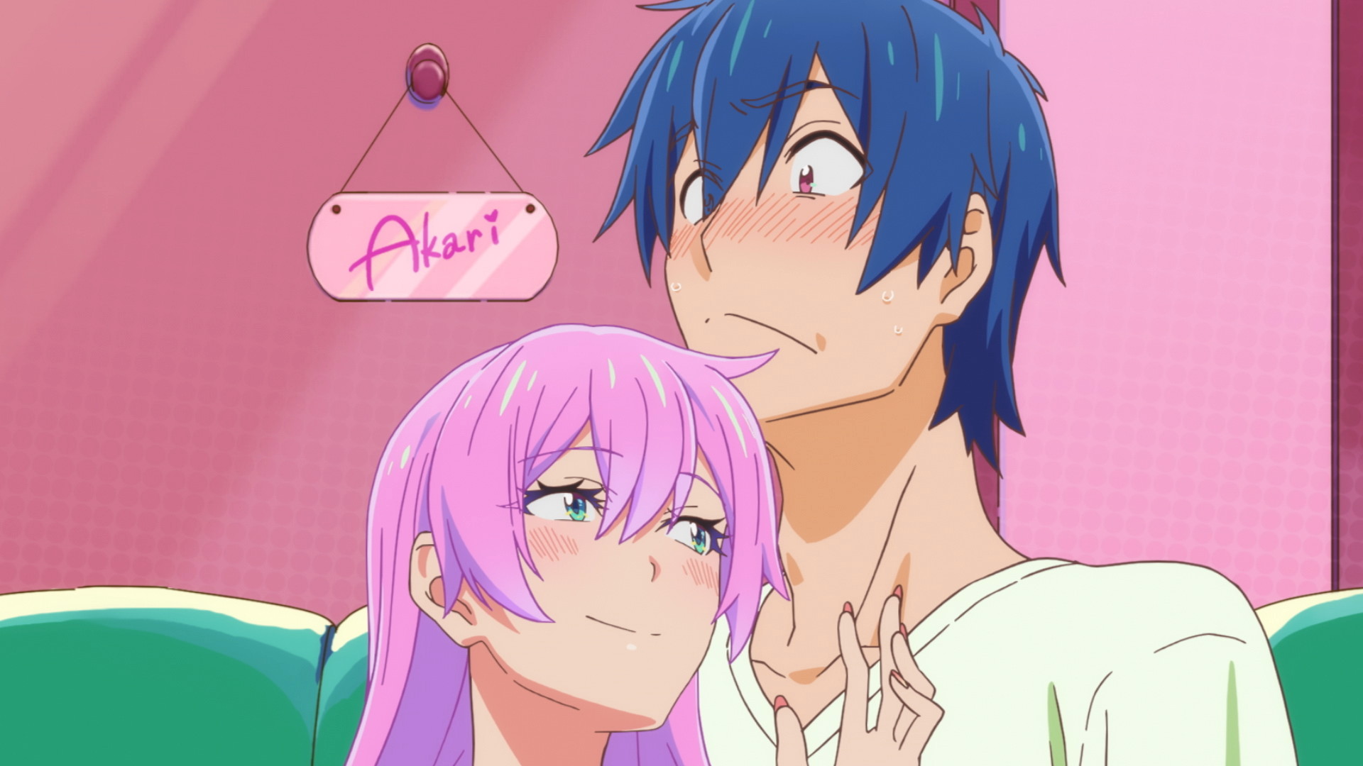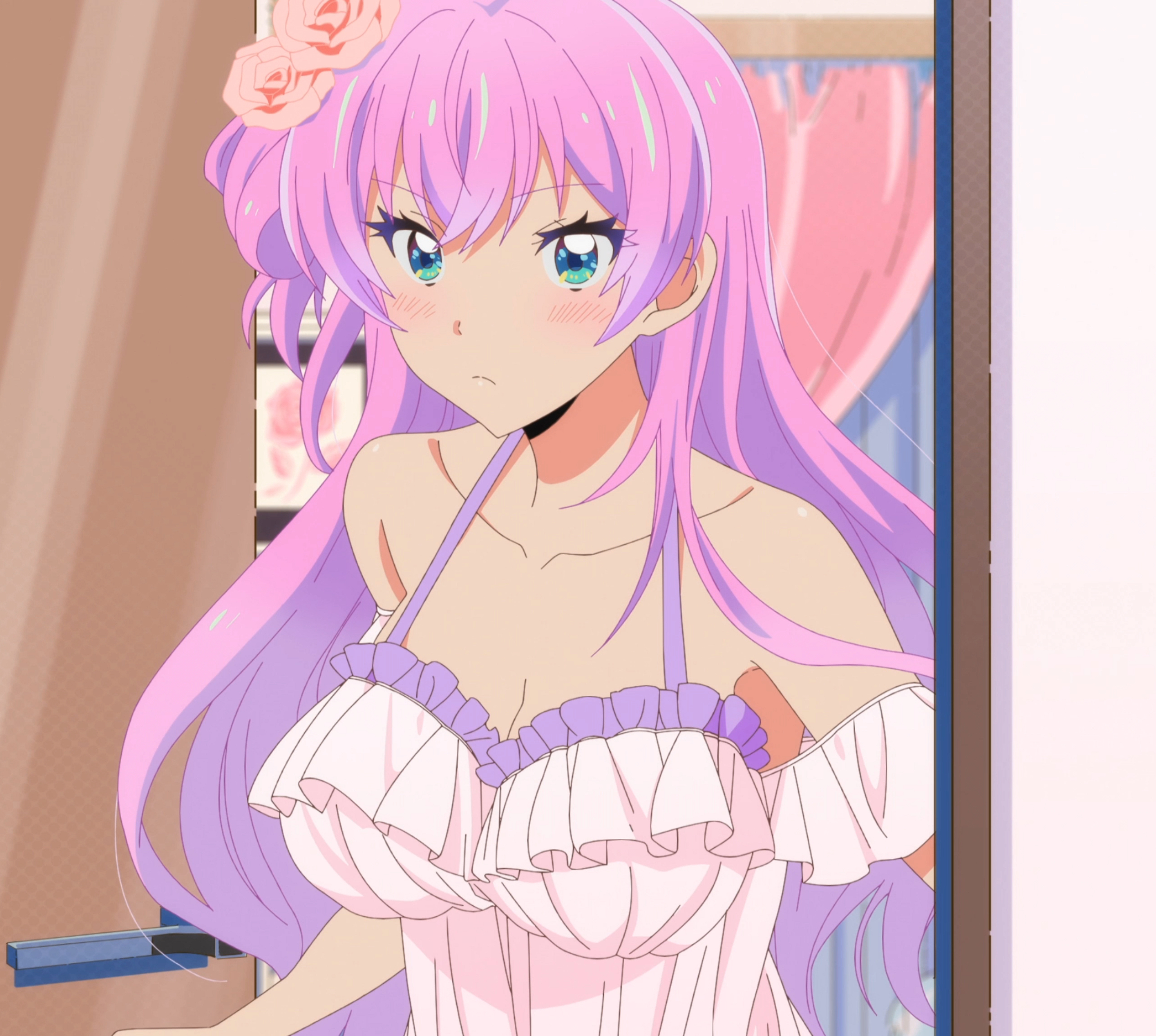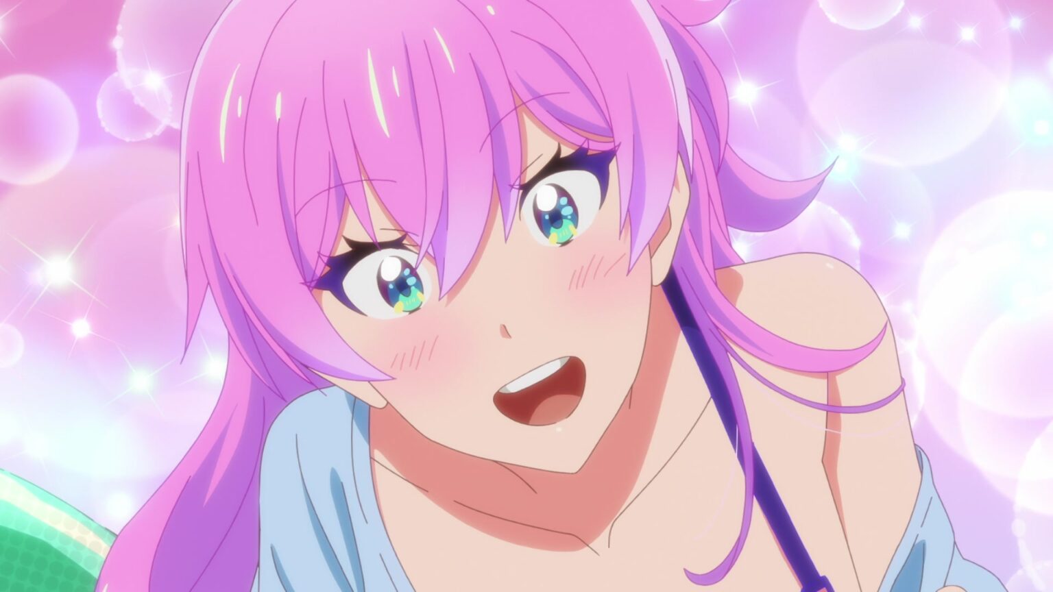 I think I can explain the pink part. Akari is all pink everywhere. Her hair is massive and flowing everywhere, and she’s all frilly and accented and pink all over despite her accessories and clothing which aren’t pink. Pink surrounds her. Another part of this, and another reason for the powerful pink feeling, are those bubble, shiny or sparkly backgrounds that we see a lot of in rom-com. Those predominantly are pink in this anime, and Akari is in a lot of them.