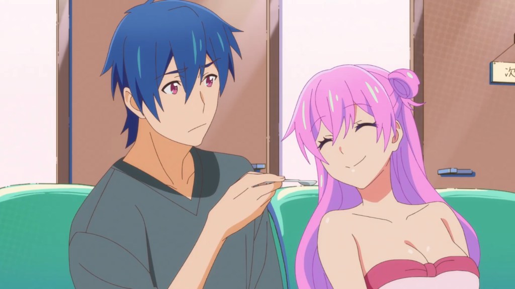 Pink or blue and purple and shiny colors—the sheen on the artwork is very strong—make for an almost candy-like feeling on all the artwork. Most rom-com is bright and pretty, but I don’t recall one that was as vividly pastel as this one. The supporting characters were a little less pastel overall, but Jirou and Akari had enough pastel to go around, and since they got so much screentime the whole show got this bright, vivid pastel appearance. I liked it. It was a little different, a little unique, and had its own kind of beauty about it.