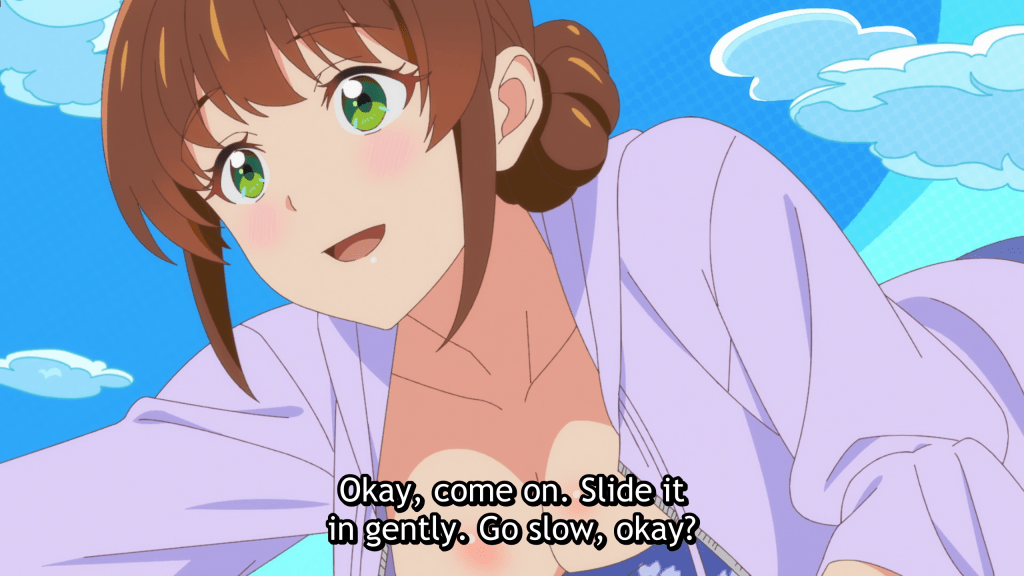 At first glance one might think this was just another instance of this kind of thing in rom-com. We see that kind of thing pretty regularly in this genre (“it’s tight!”, “I’ve never felt this way before!”, “come inside!”—you get the idea). The innocent speech of younglings learning about love which us overly experienced adults understand the innuendo of, for better or worse. So at first you think Shiori’s uncomfortable gibberings are just another instance of that. But something particular about this made me think that this was actually intentional done by the writers to highlight the difference between Jirou and Shiori, and by extension highlight the chemistry between him and Akari.