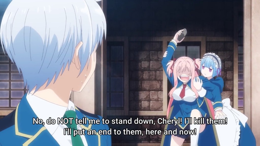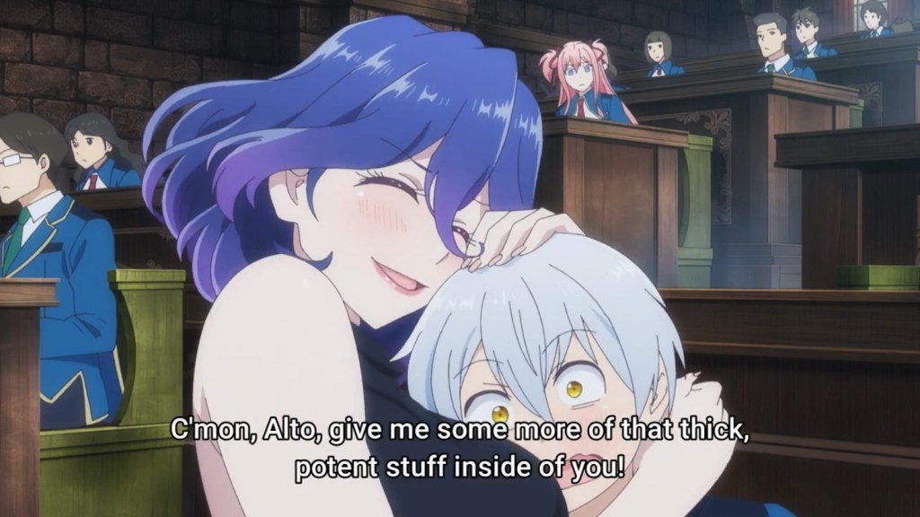 There is a student council. Its members are snobby, overbearing, strong, and their place in the hierarchy of society is slightly above Emperor of the Sea. Haven’t we seen this story before? It’s okay, but we have seen it before. The boys on the council are irrelevant. In the face of the boyish Chris (me likey likey, though she’s a little overbearing) and the tall and powerful Jessica (she beats up Alto a handful of times), of course these human males are irrelevant. Then there’s the empress, sorry, the student council president, herself, Elena. If any of you have seen The Eminence in Shadow (which you should) then you’ll recognize almost exactly the same character here in Elena as Alexia Midgar in The Eminence in Shadow, which mostly is due to Kana Hanazawa, who does a great job with these haughty voiced girls. And the white hair.