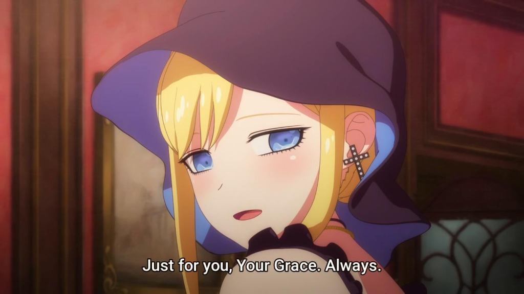 I absolutely can’t neglect Bocchan either. Alice is the creme de la creme in this show by far, but then there’s this guy named Natsuki Hanae playing the Duke of Death. Another newcomer with a great voice for this show? No: he’s only the guy that plays Ken Kaneki (Tokyo Ghoul), Kousei Arima (Your Lie in April), and Tanjiro (Demon Slayer), among others. Yeah, he’s been around. Since Bocchan is usually in the same room with Alice and is there conversing with her, much of his performance is overshadowed by Ayane Mano, although he does a notably great job with the dialogue where Bocchan confesses his love to Alice, the handful of times that happens. But when he gets with other characters or is by himself, you can listen to him a lot more and you can tell he really does a good job. Especially when he gets going with Viola (Inori Minase) or those two witch clowns Zain and Caph. It’s a lot of fun to listen to him chatter with those guys.